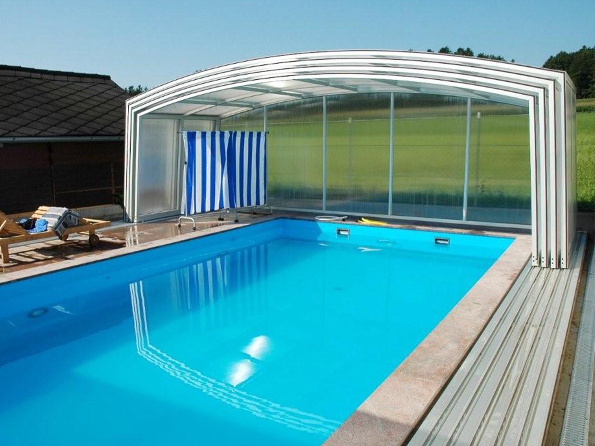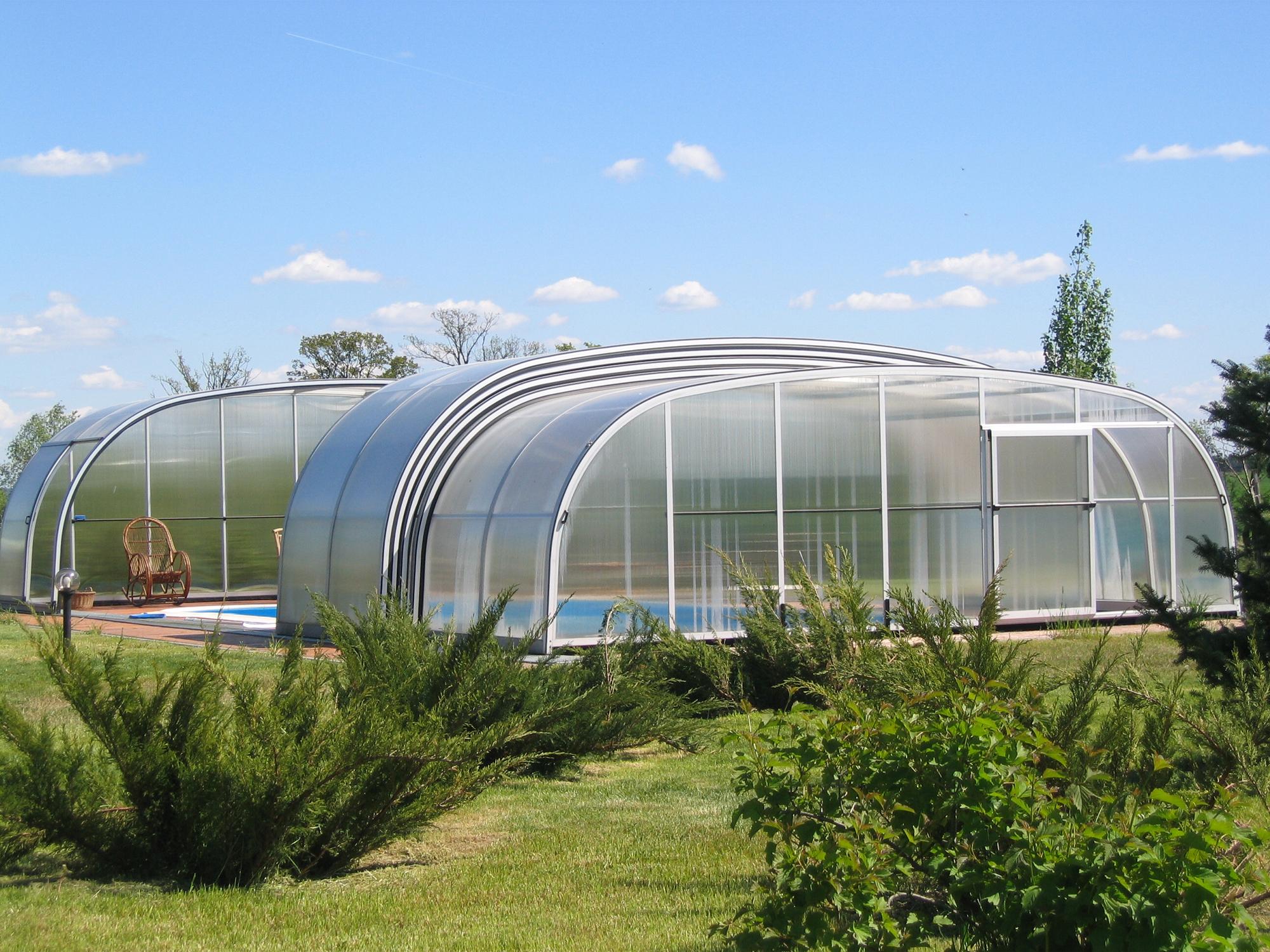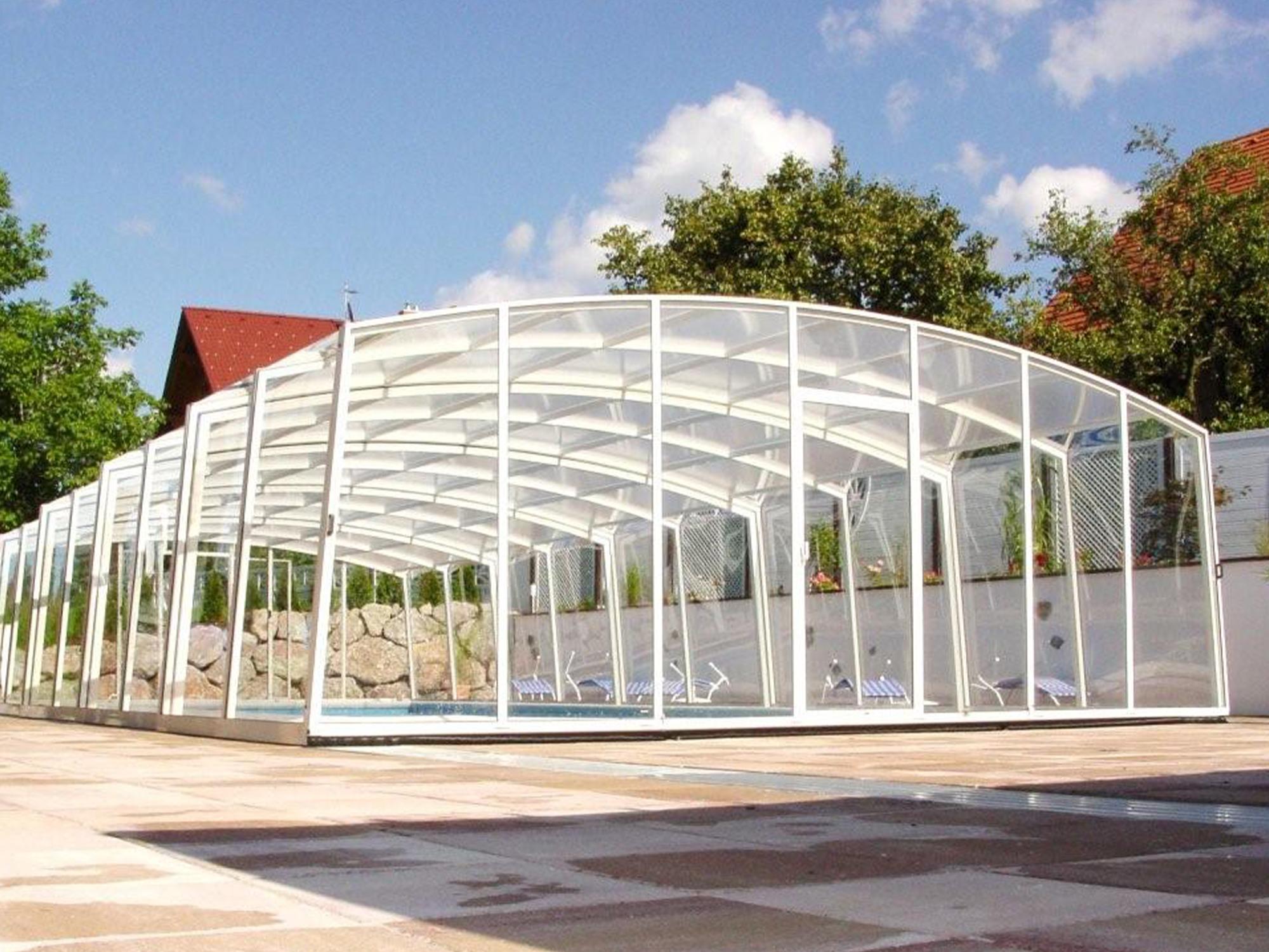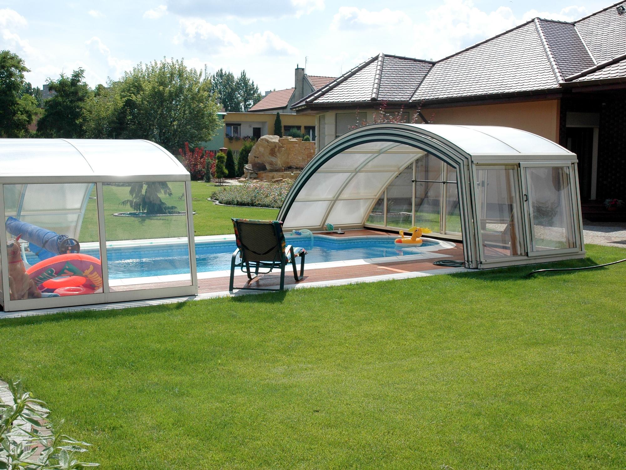 High pool enclosures are suitable for customers who would like to walk under the enclosure or even create lovely leisure space. Thanks to an advanced sliding system you can slide individual segments in both directions (segments are not locked into each other - that way you can move each segment freely) In matter of minutes the whole enclosure can be retracted back away from the swimming pool area. When the segments are pushed together you can create a useful storage space that it is protected from wind and offers a convenient area for garden furniture or relaxation with family and friends. High pool enclosures provide you with freedom of movement around the enclosed pool making it a perfect solution for sheltered swimming and sitting for family and friends.