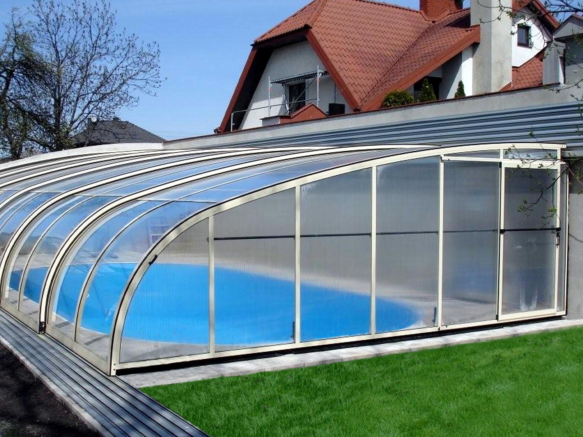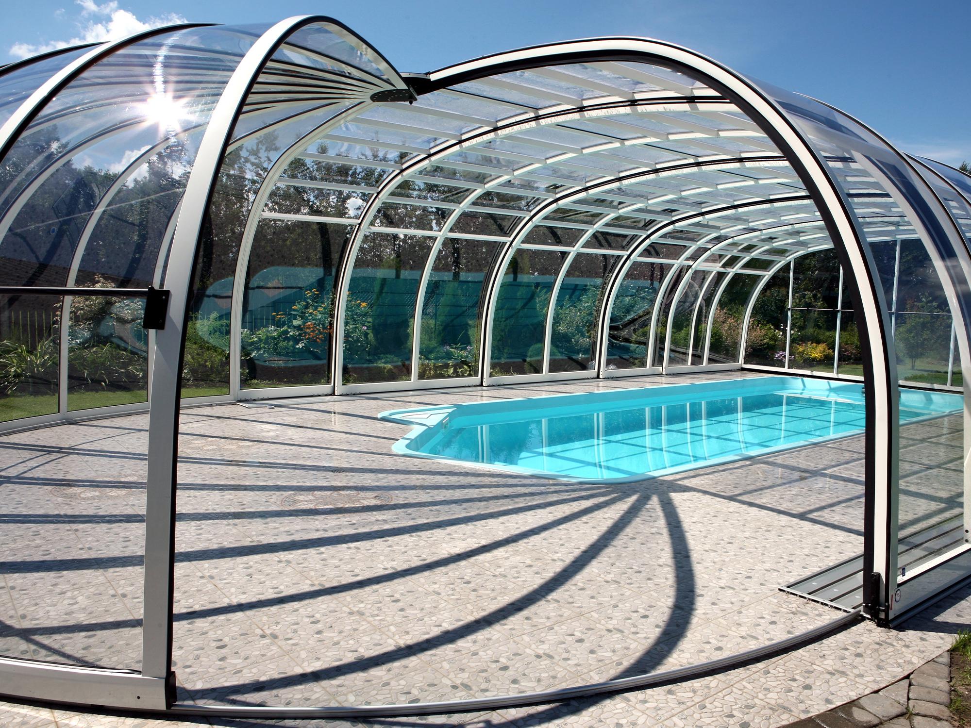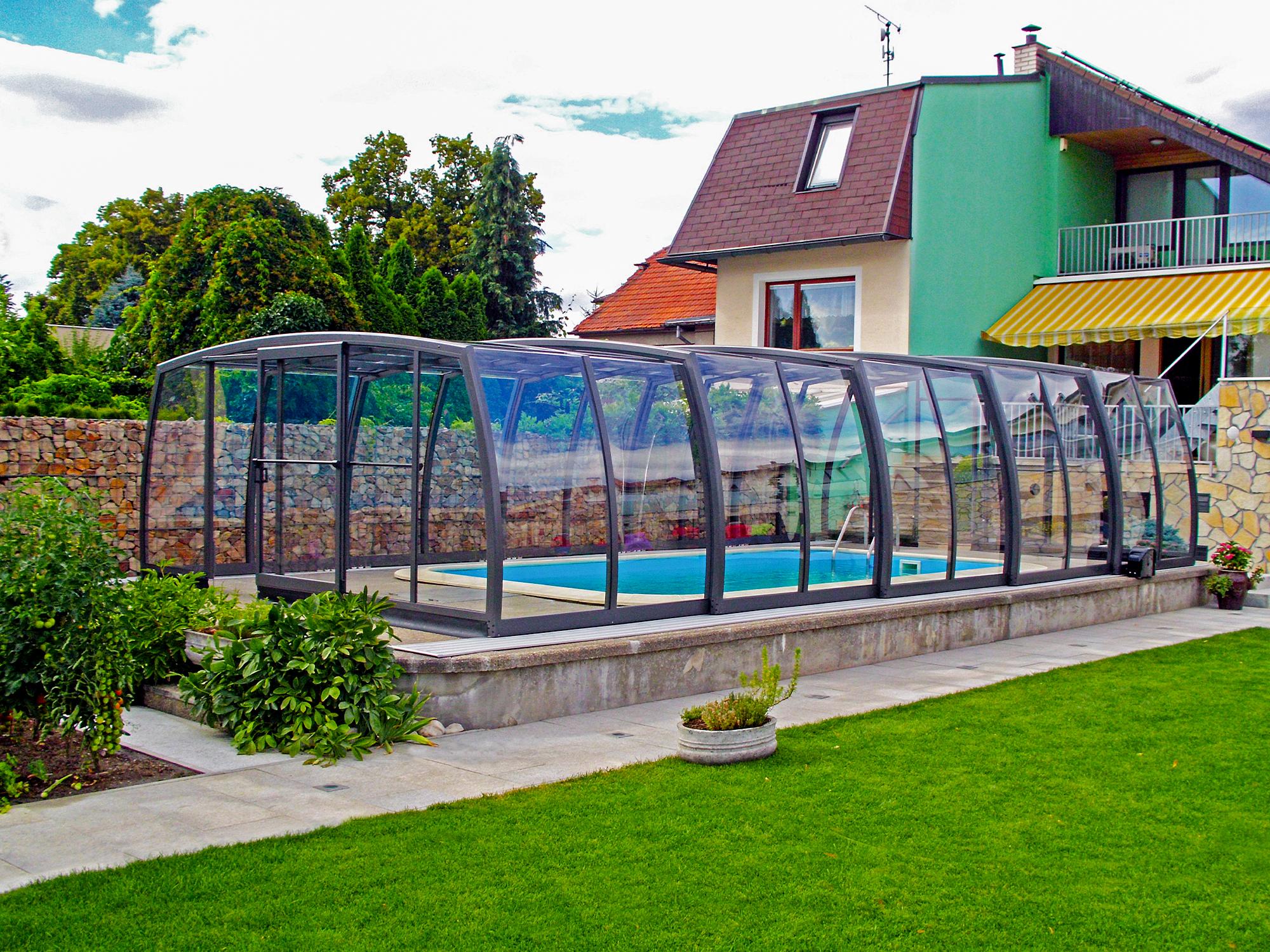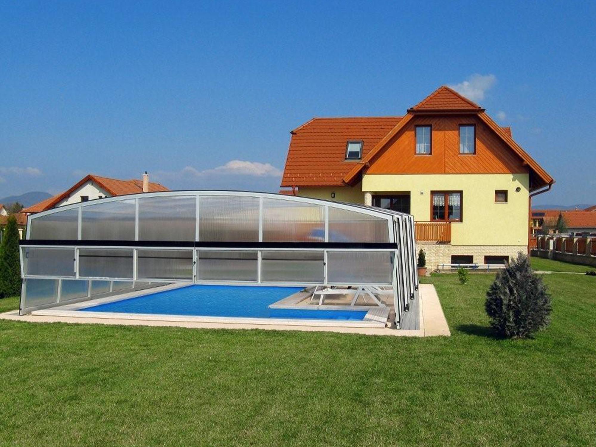 High pool enclosures are suitable for customers who would like to walk under the enclosure or even create lovely leisure space. Thanks to an advanced sliding system you can slide individual segments in both directions (segments are not locked into each other - that way you can move each segment freely) In matter of minutes the whole enclosure can be retracted back away from the swimming pool area. When the segments are pushed together you can create a useful storage space that it is protected from wind and offers a convenient area for garden furniture or relaxation with family and friends. High pool enclosures provide you with freedom of movement around the enclosed pool making it a perfect solution for sheltered swimming and sitting for family and friends.