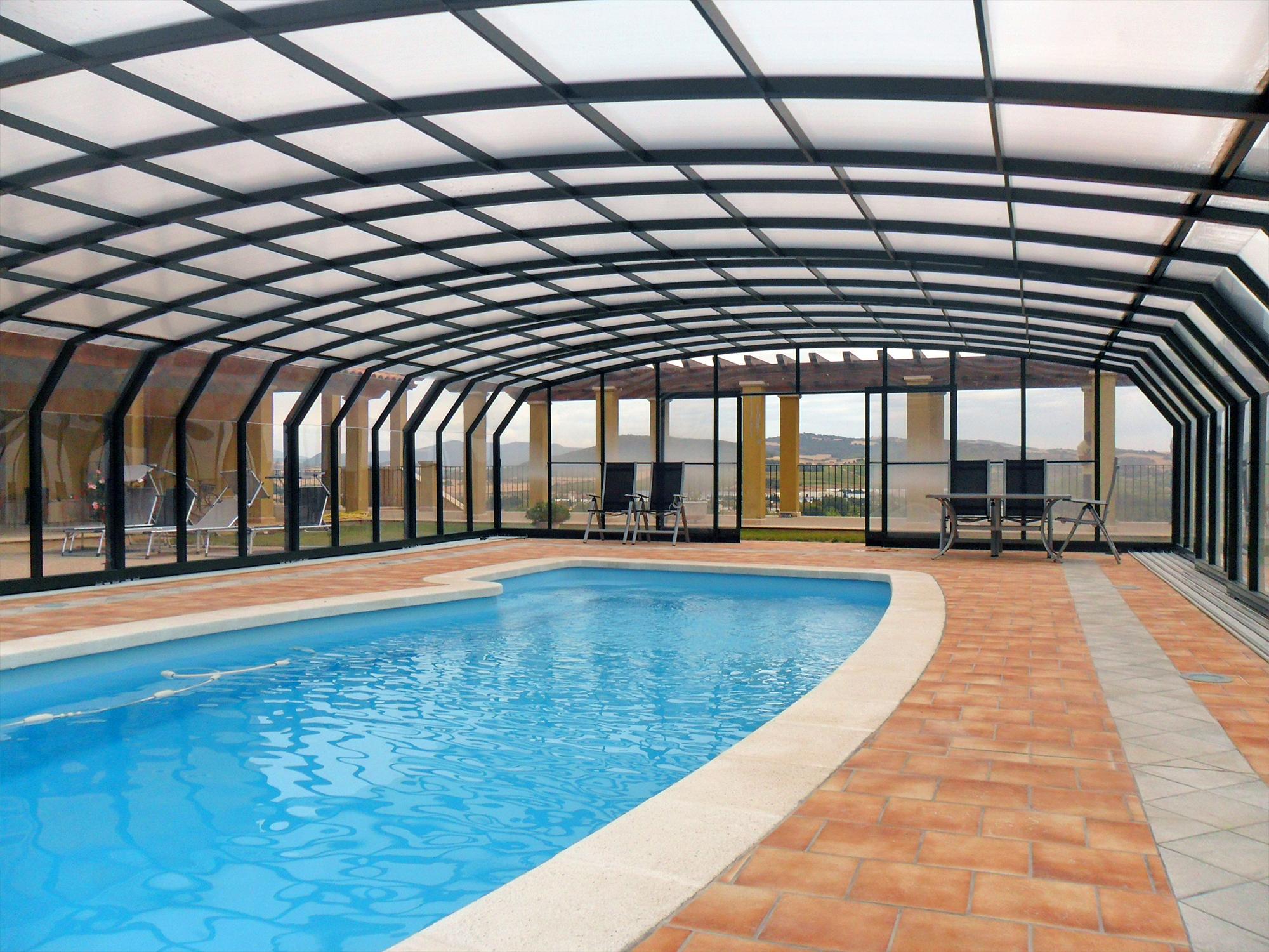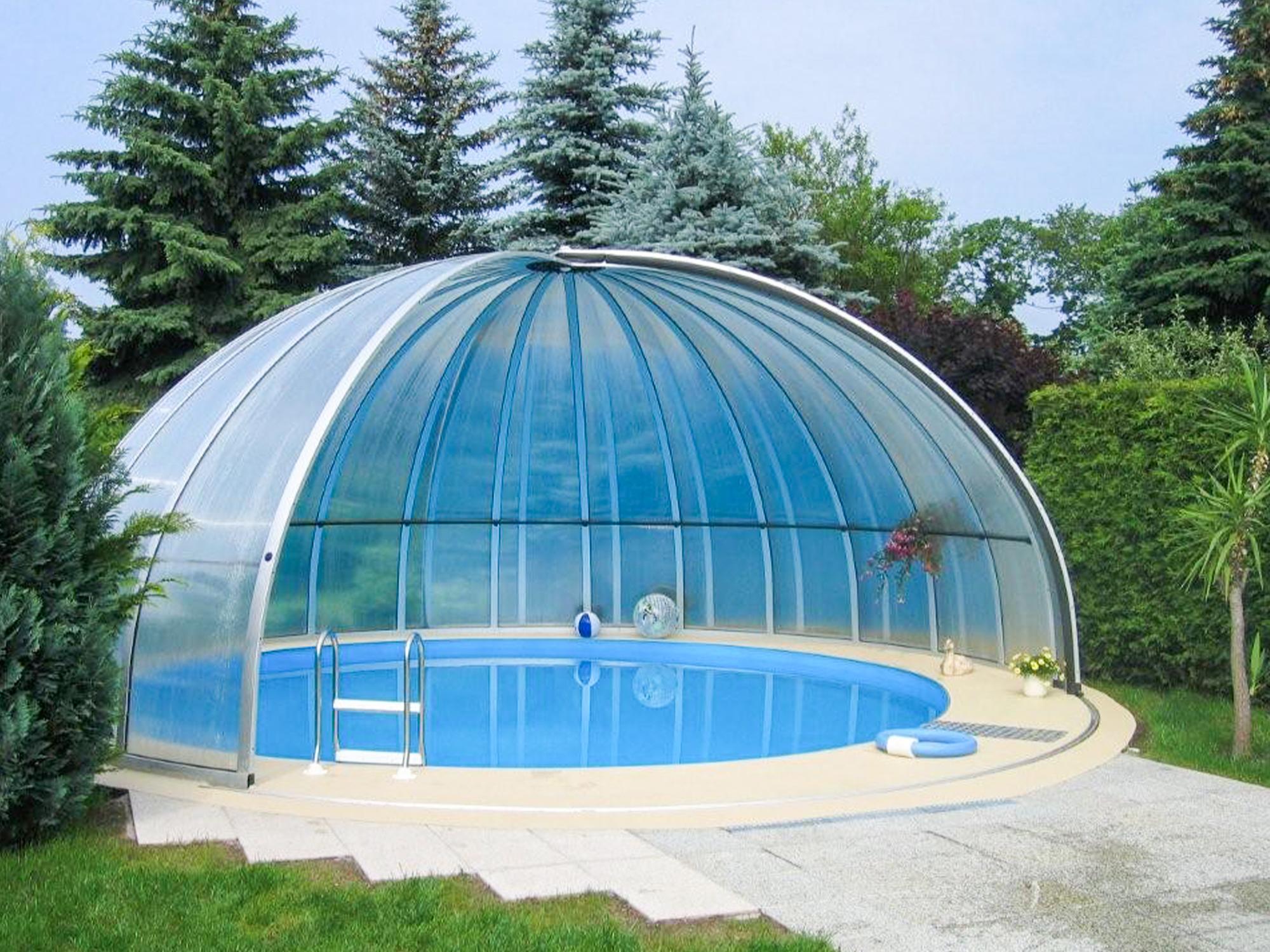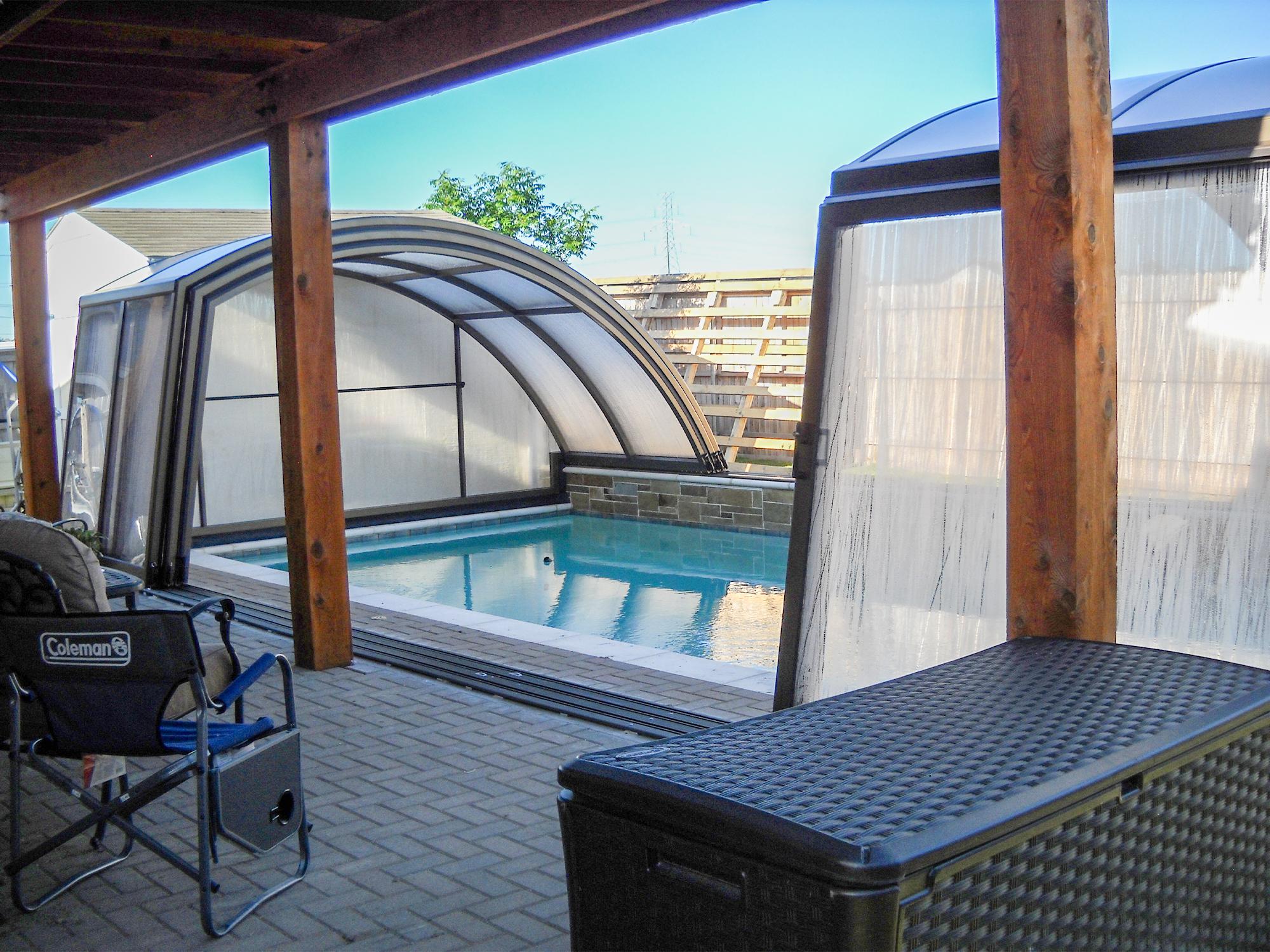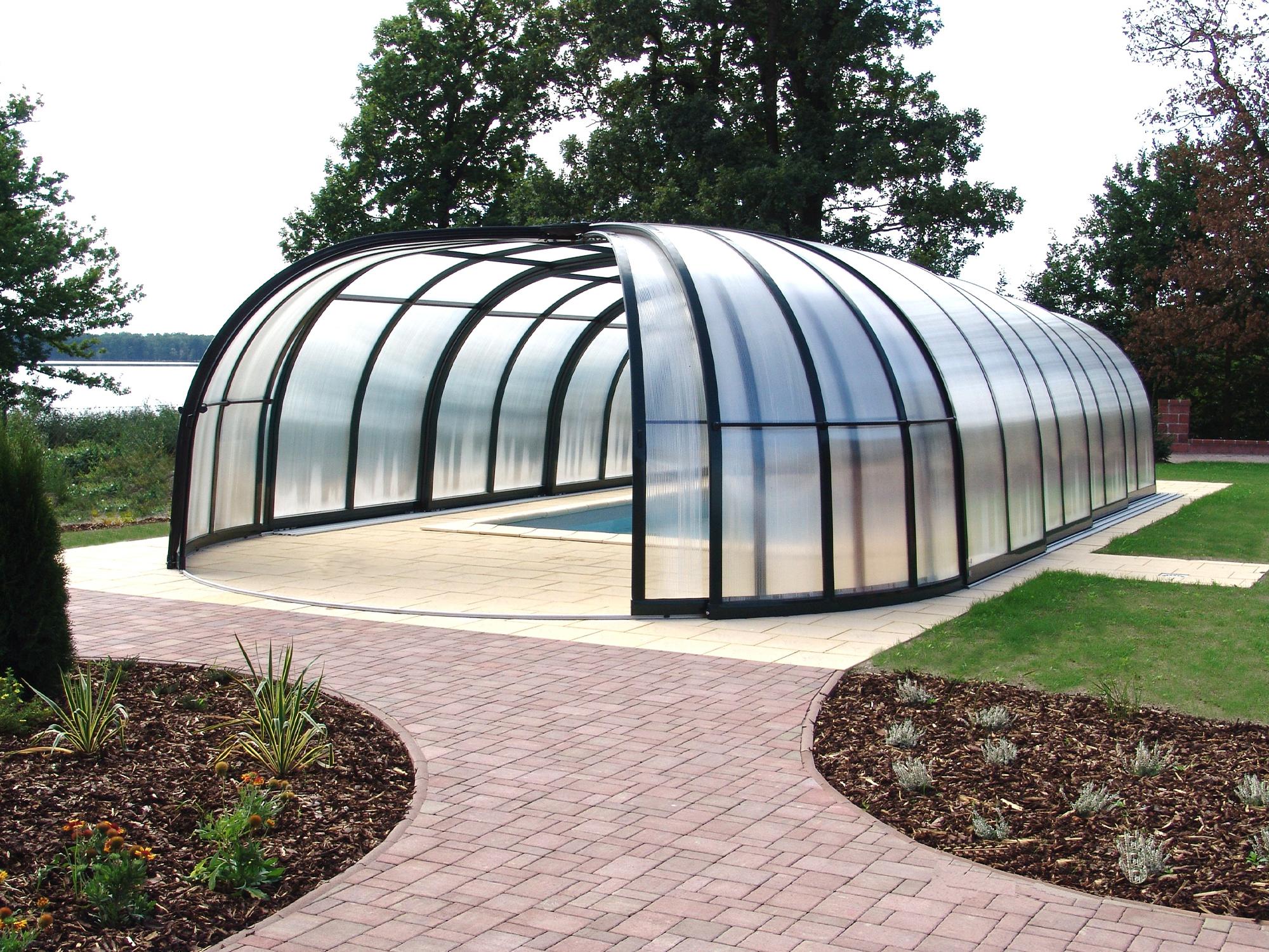 High pool enclosures are suitable for customers who would like to walk under the enclosure or even create lovely leisure space. Thanks to an advanced sliding system you can slide individual segments in both directions (segments are not locked into each other - that way you can move each segment freely) In matter of minutes the whole enclosure can be retracted back away from the swimming pool area. When the segments are pushed together you can create a useful storage space that it is protected from wind and offers a convenient area for garden furniture or relaxation with family and friends. High pool enclosures provide you with freedom of movement around the enclosed pool making it a perfect solution for sheltered swimming and sitting for family and friends.